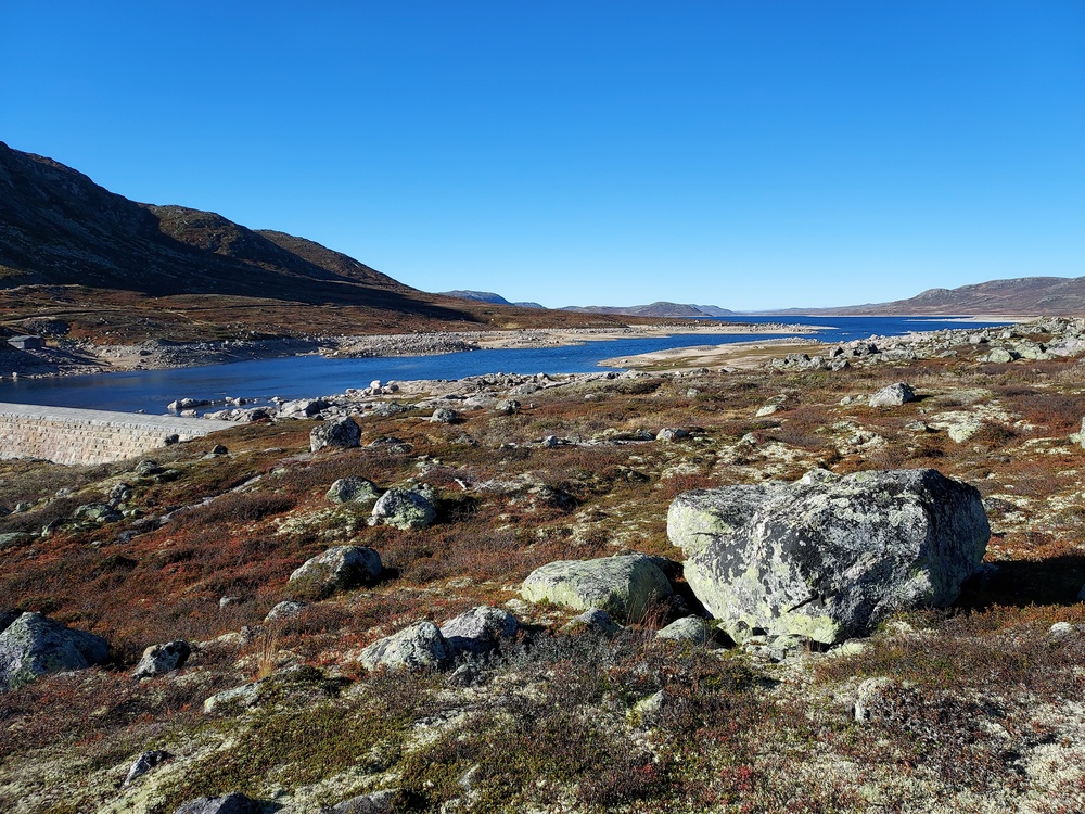 | Snart ved Kalhovddammen (1086 moh), skimter demningen og Kalhovd Turisthytte, Det er populært å ta heisen opp fra Rjukan og sykle via Kalhovd tilbake til Rjukan. |