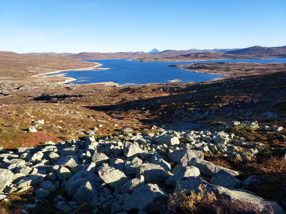 | Kl 17:17; Da har jeg kommet halveis opp åsen, Bilde over Kalhovd fjorden. Mitt i bilde kan man se Gautatoppen. |