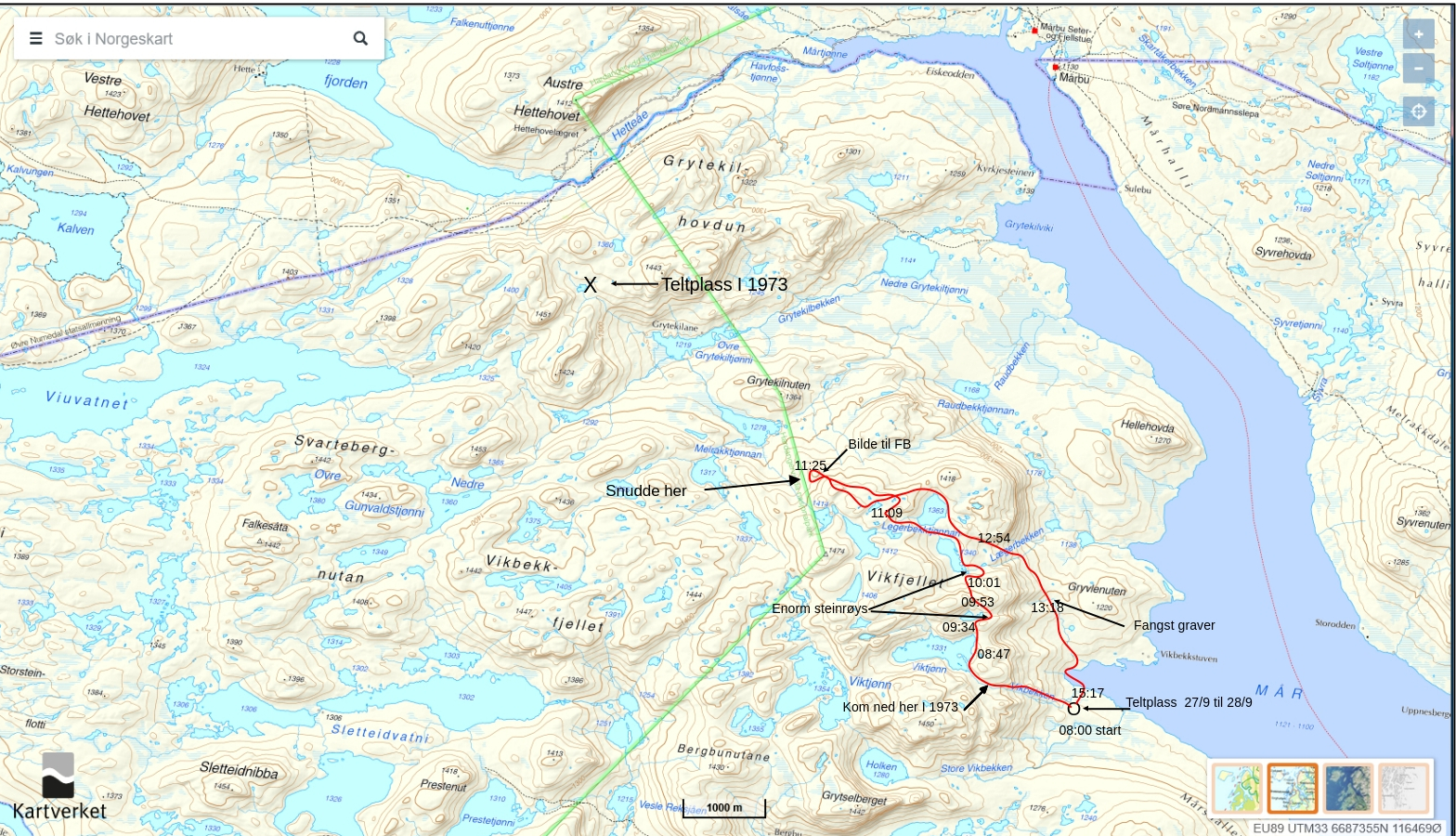| Kl 9:11; Har kommet til Viktjøn (1331 moh), Er litt i tvil hvor jeg kom ned da jeg gikk over Vikfjell i 1973. |