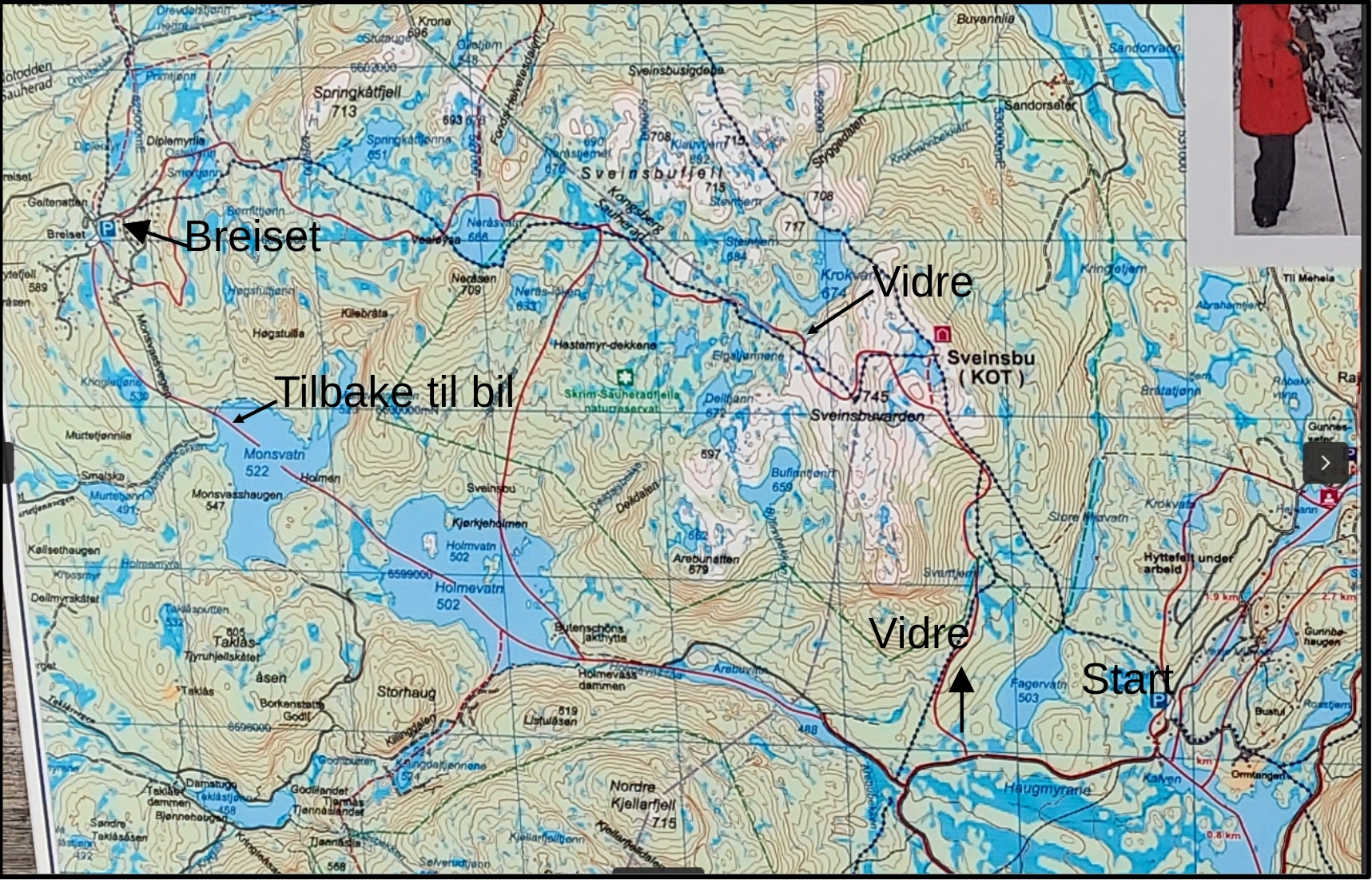 | Jeg har skrevet på karte ruten vi gikk, først til Sveinsbu og vidre til Breiset. |