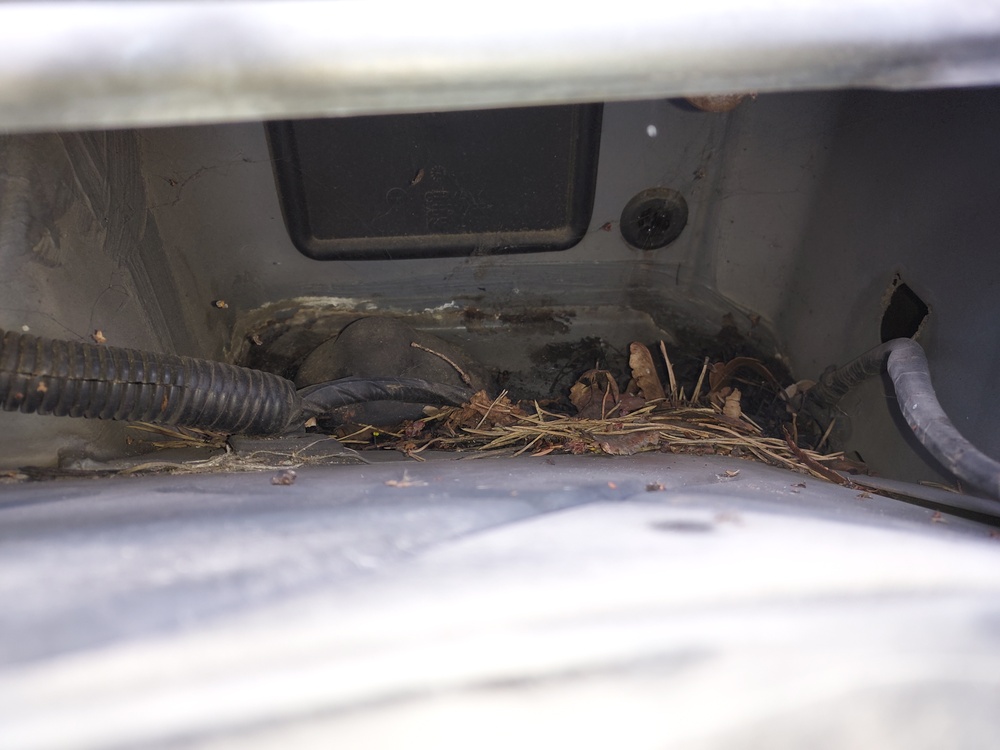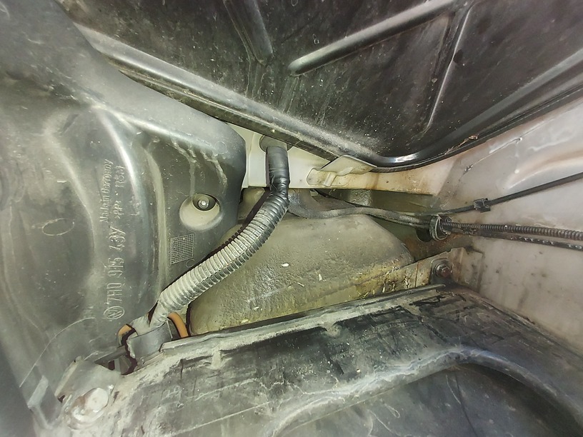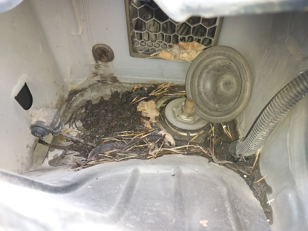 | Vann oppsamler: Høyre side ser ille ut, bruker støvsuger for å gjøre reint. Gummihetten var ikke satt på, mulig årsak til mye rust i hullrom under. |