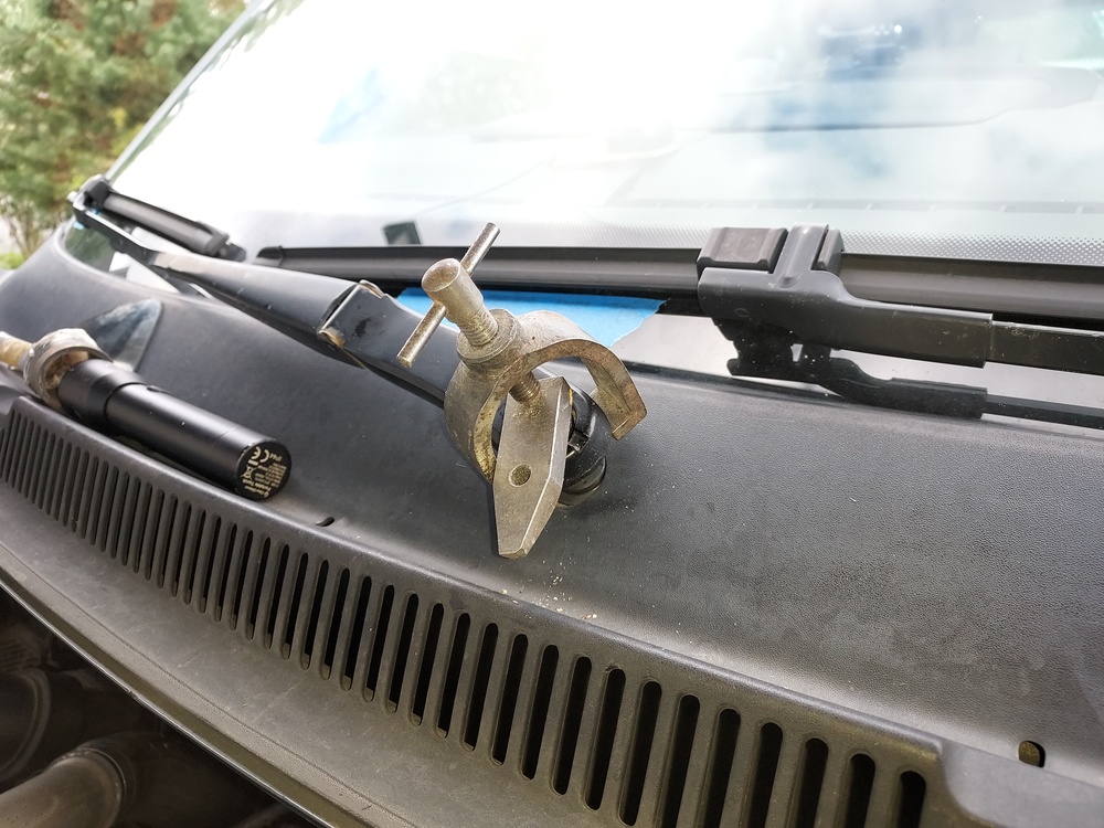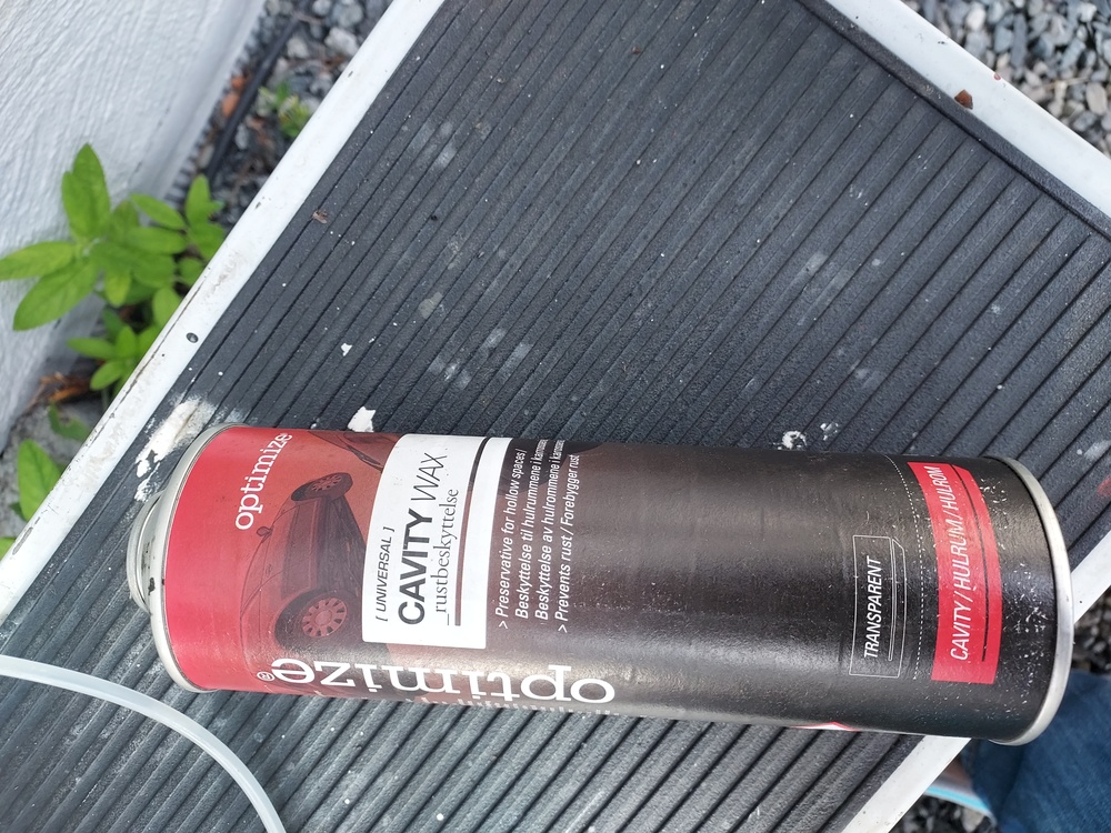| Dette ser forferdelig ut. Her har jeg sprayet CAVITY WAX, vi får se neste år om det hjelper. Dagen etter har jeg smurt med Gris over rustskadene. Det er vanskelig å komme til, måte ta ut luftfilteret. |